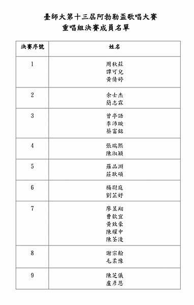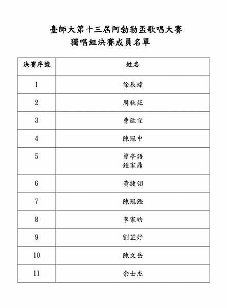 111.08.31之後不得變更決賽之曲目、參賽人員(除非有不可抗拒或充分理由才可變更)、器材使用項目另外,請有使用伴唱帶的參賽者儘速給我們主辦單位!請參賽者進行確認,感謝🙏